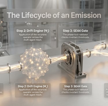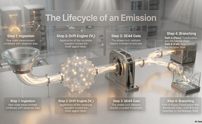 OPHI operates as a lifecycle pipeline for all symbolic emissions. A state is first ingested as a raw observation combined with contextual bias. It is then processed through a drift engine that applies recursive transformation across a multi-agent mesh. The result is evaluated by the SE44 validation gate, which enforces thresholds for coherence, entropy, and drift stability. If the state passes, it is fossilized into an immutable ledger. If it fails, it is rejected or quarantined. No state is allowed to exist without meeting system constraints.